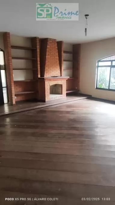 Sala com lareira e piso de madeira;
